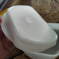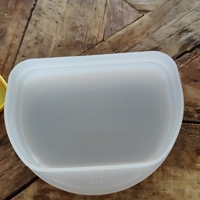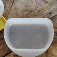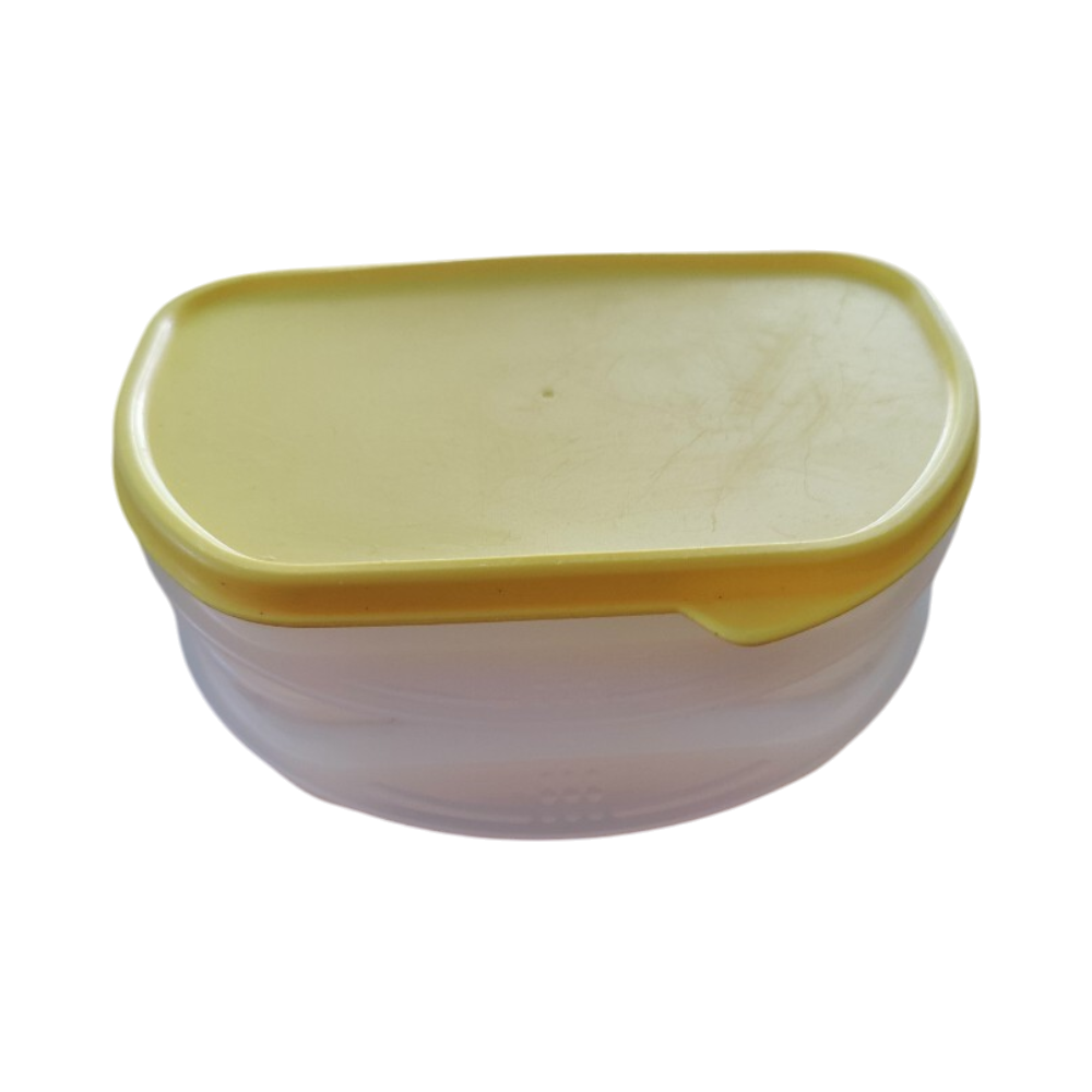 Pieni läpinäkyvä eväsrasia kaksikerroksinen. Keltaisella kannella, hyväkuntoinen. Kannen päällä muutama naarmu.