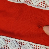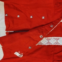 Vintage, hand made Drindl style red mini dress with white embroidery. It doesn't have the undershirt, so the neckline is very wide as is. It has a tiny flaw, shown in the last photo.