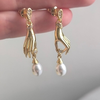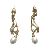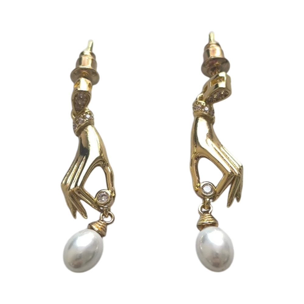 Gold-tone hand drop earrings with faux pearl and crystal accents.