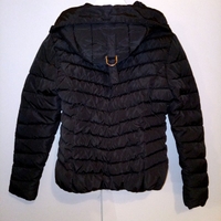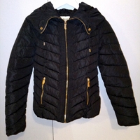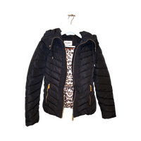 Musta talvitakki. Sisällä leopardi kangas. Kainalossa siististi paikattu reikä (vika kuva). Koko XXS menee myös itselleni eli XS koolle