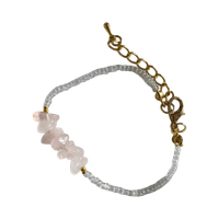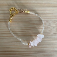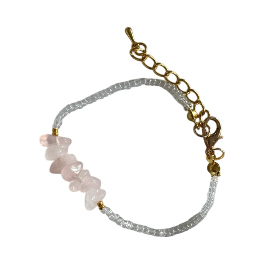Käsintehty vaaleanpunainen ruusukvartsirannekoru, lasihelmiä ja kullanvärisillä yksityiskohdilla🩷