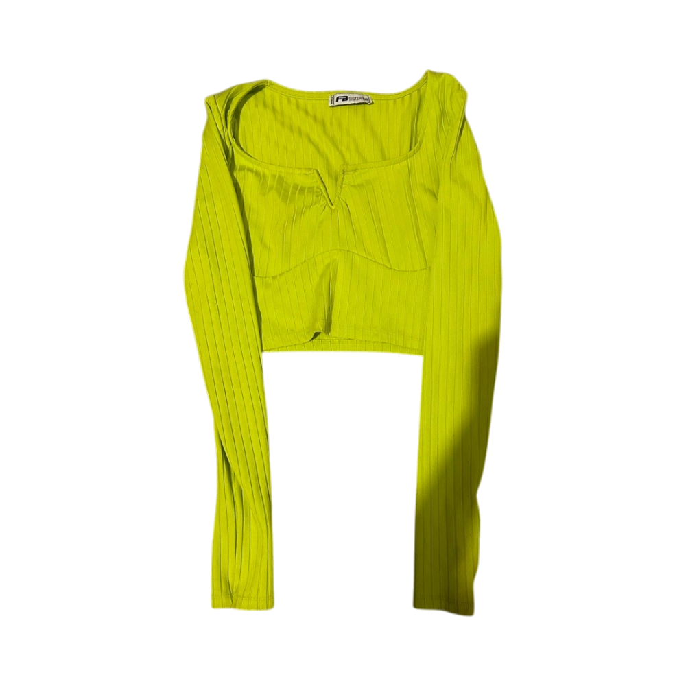 Neonkeltainen ribbikangas, pitkähihainen crop-top.