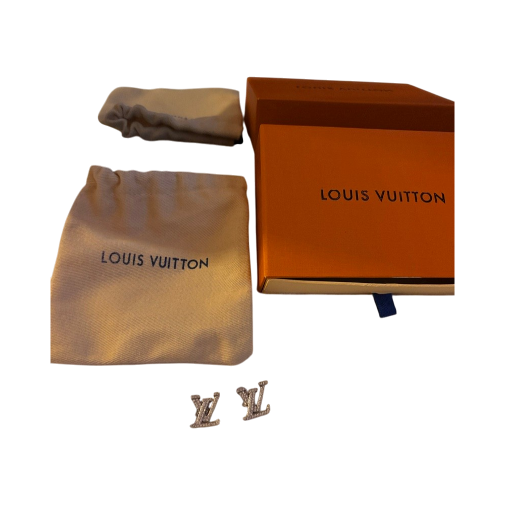 Silver-tone LV logo stud earrings with crystal detailing.