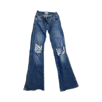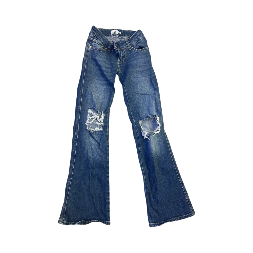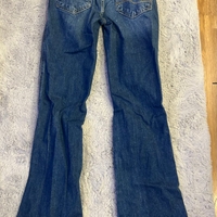Farkut lievässä kulutuksessa, polvien repeämillä ja bootcut-malli.