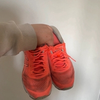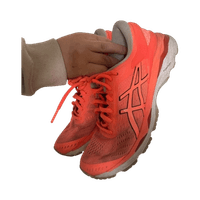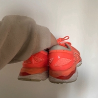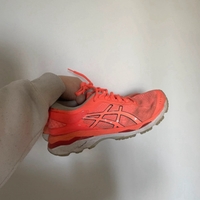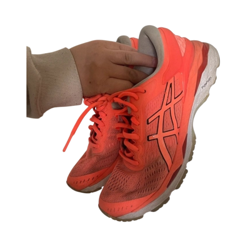 Käytetyt naisten juoksukengät, hyvät jalassa, näkyvää käyttöä.