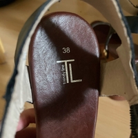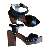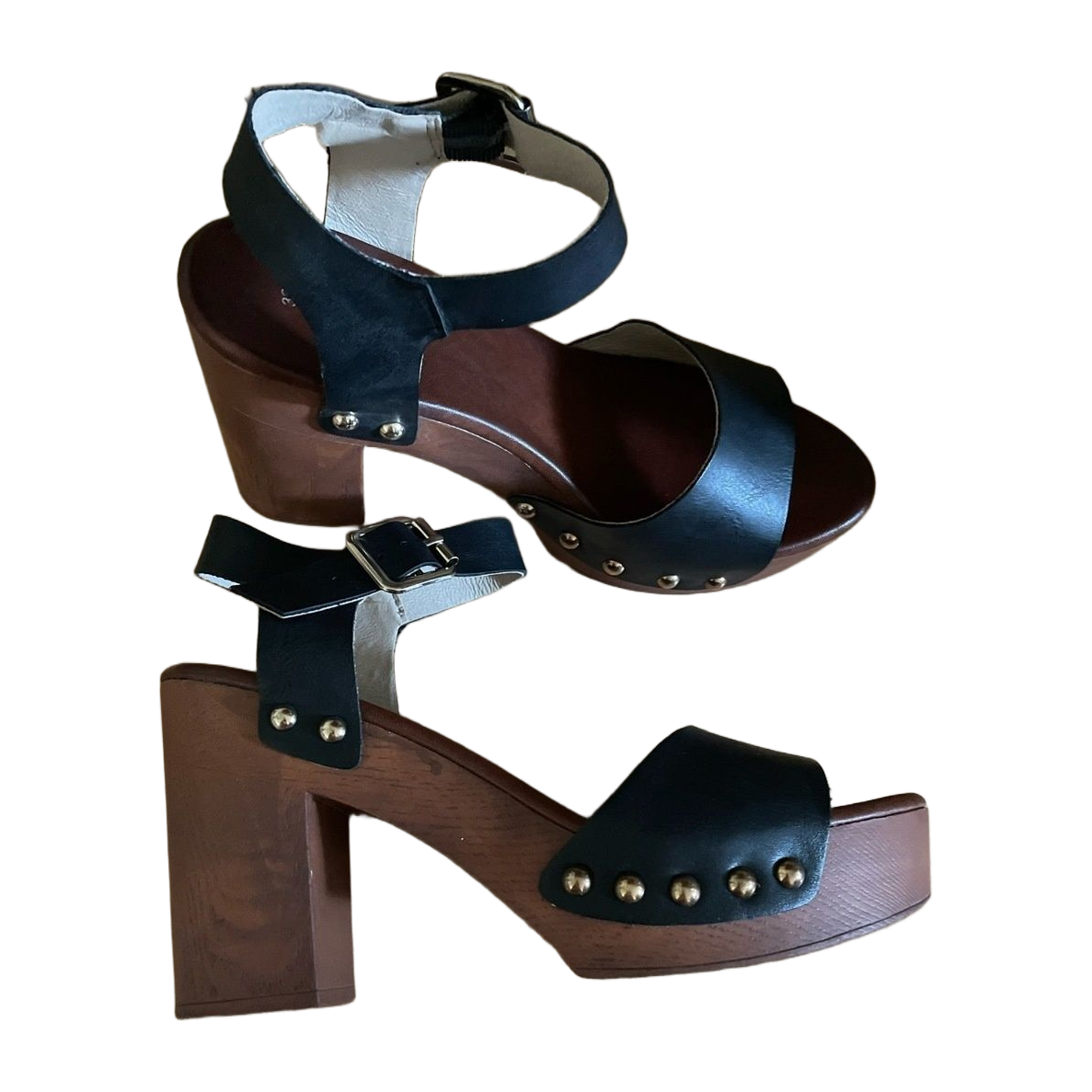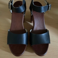 Kivat sandaalit. Tekonahkaa, pohja puun näköistä, kevyttä materiaalia. Kulumajälkiä oikeastaan vain pohjassa. Korko 10cm, plato 3,5cm.