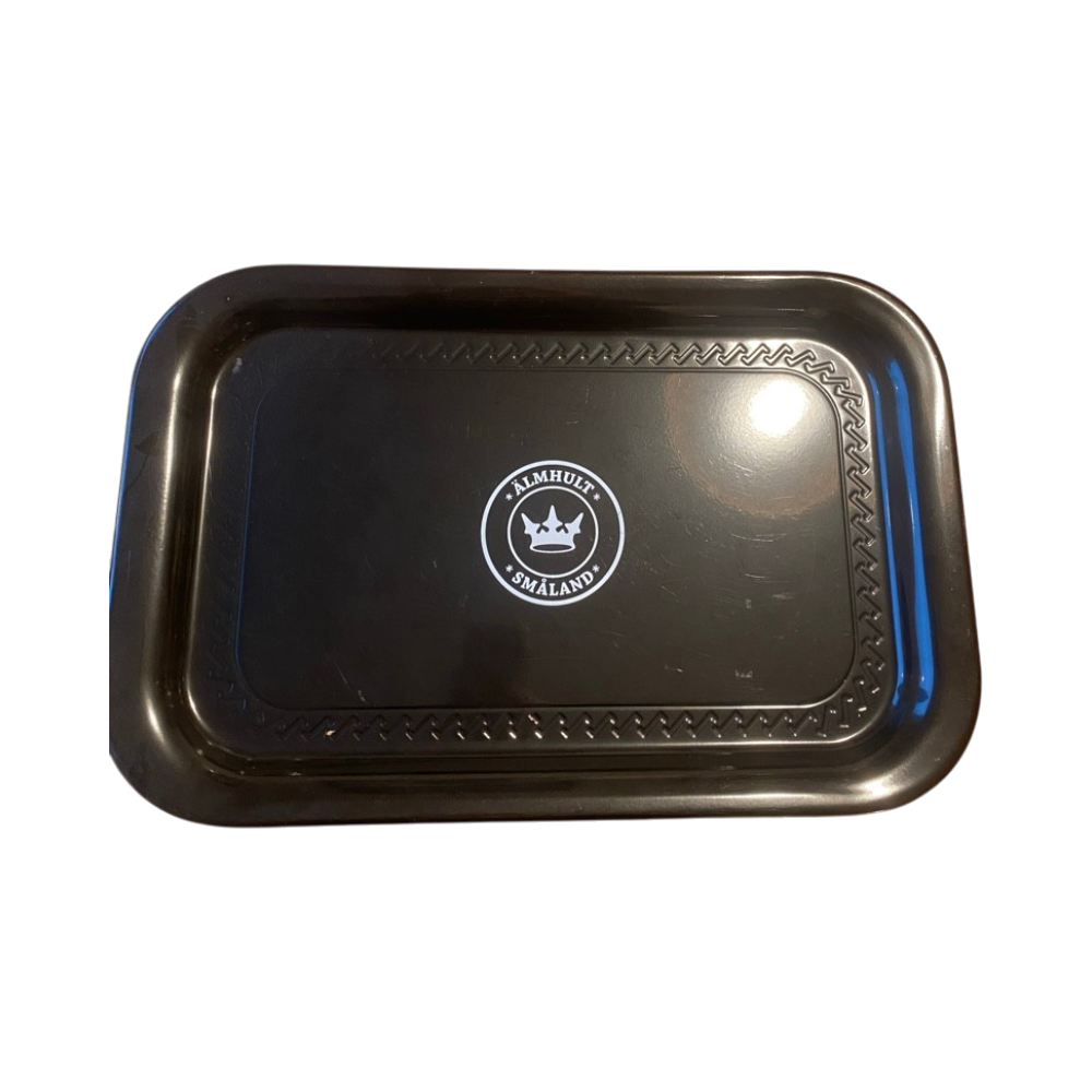 Muovinen musta tarjoilulauta, kevyttä kulumaa ja käytön jälkiä. Koko 50x32cm