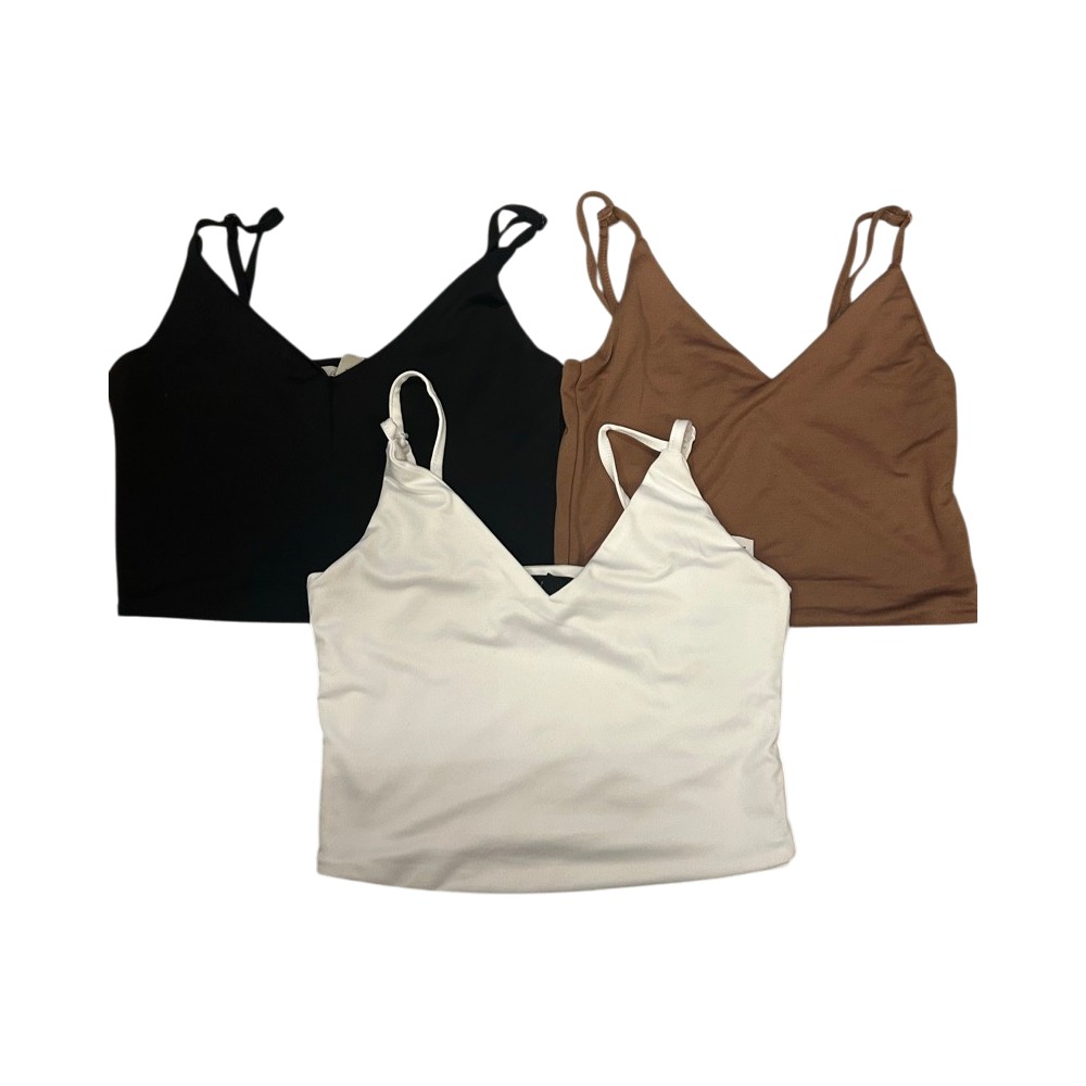 Kolme v‑mallista toppia, musta, valkoinen ja ruskea, hyväkuntoiset.