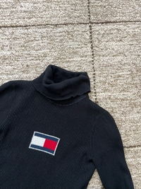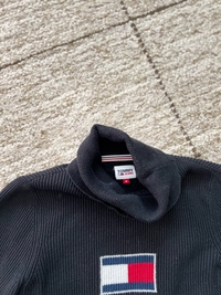 Naisten musta pooloneule, jossa Tommy Jeans -logo edessä.