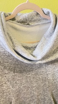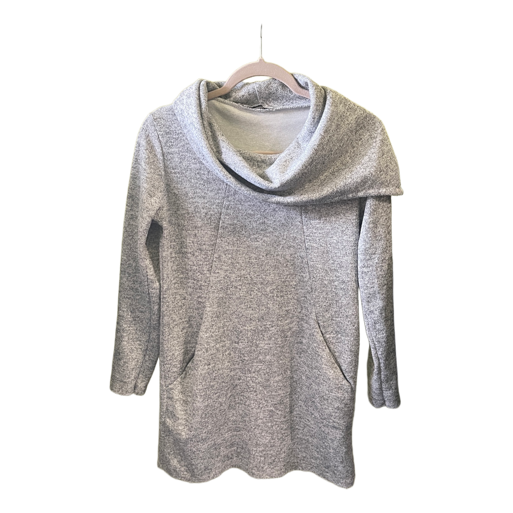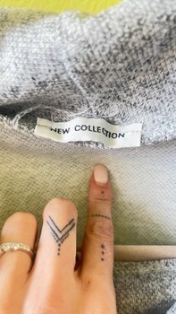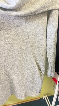 Pilkas megztinis su apykakle ir kišenėmis. Pagamintas iš poliesterio, viskozės ir elastano.