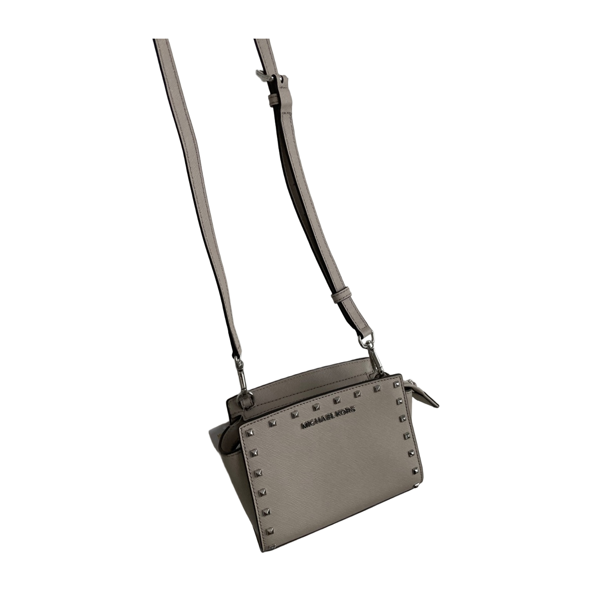 Beige Michael Kors Selma mini crossbody bag with silver studs and adjustable strap.