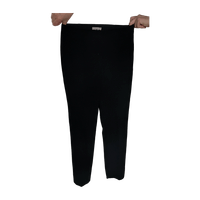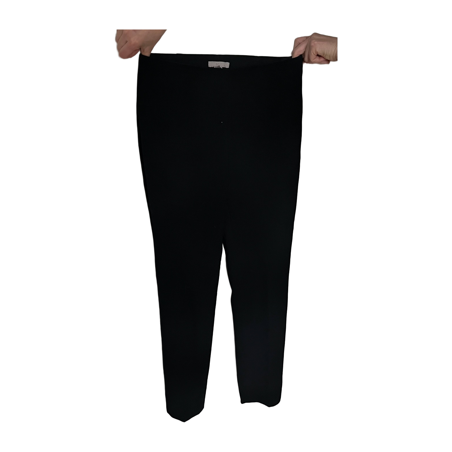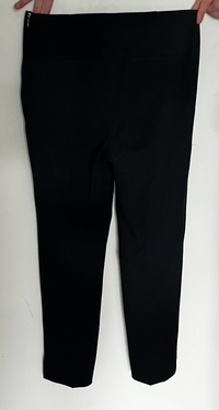 Naisten siistit, mustat suorat housut. Takana suorat taskut, lahkeissa pienet halkiot. Vetoketju sivulla, vyötärössä paksu joustoa tuova kuminauha. Hyvin siistit