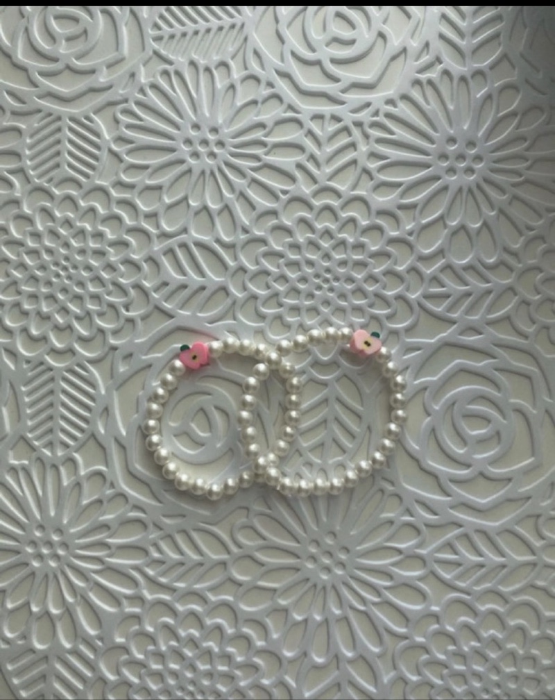 Kaksi vaaleaa itsetehtyä rannekorua.