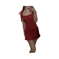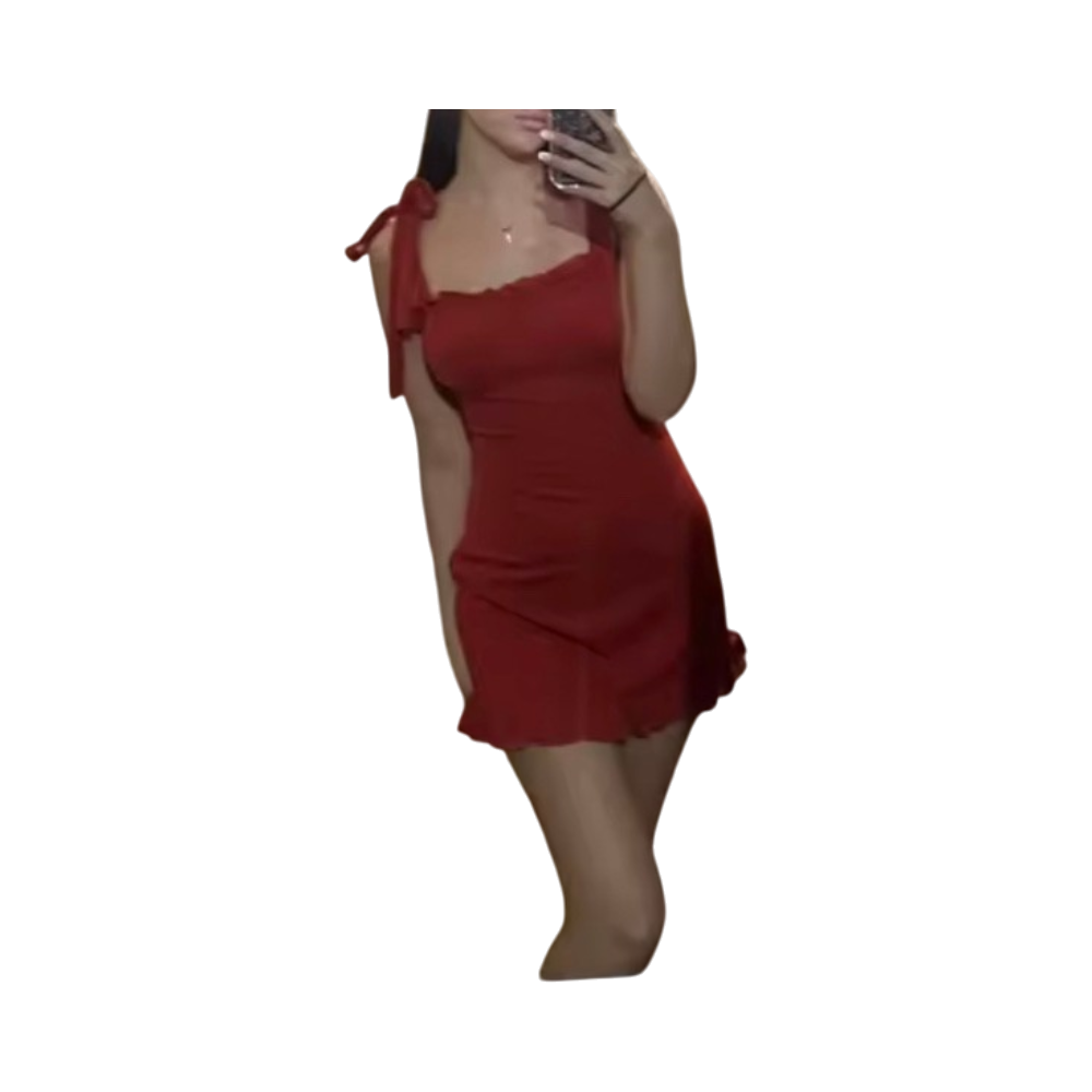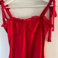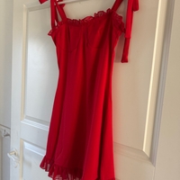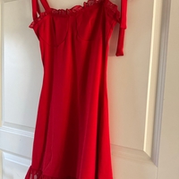 Lyhyt punainen mekko olkaimilla ja röyhelöreunuksella.