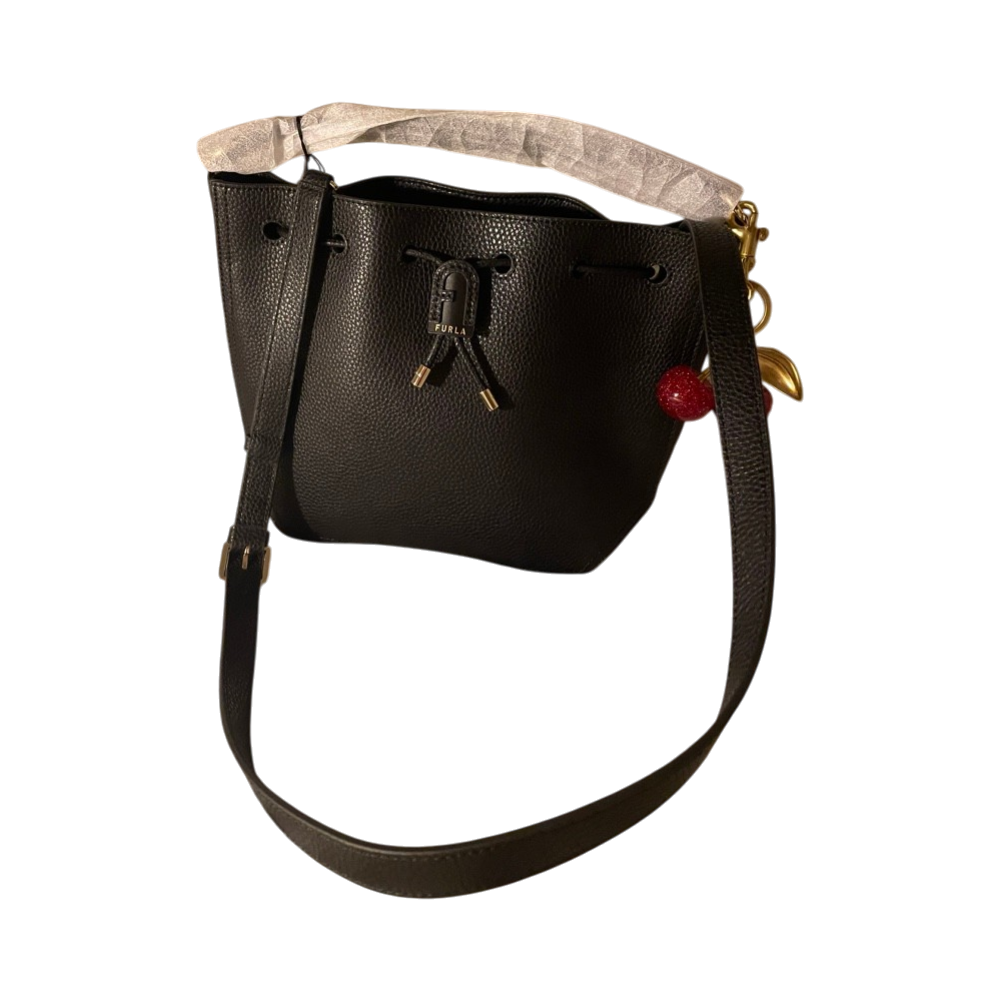 Uusi Furla Atena Keria bucket bag, väri musta. Kuvassa näkyvä kirsikkariipus 🍒 sisältyy mukaan, käyttämätön ja uusi. Voin jättää sen pois, jos et halua sitä.