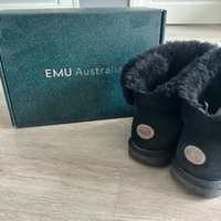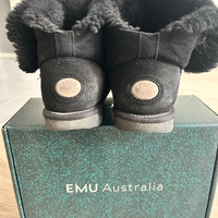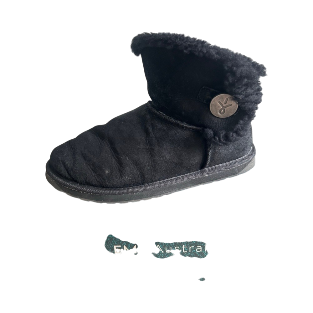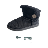 Lyhytvartiset mustat lampaanvillavuoritöppöset, lämpimät, paljon käytetyt, toisessa kengissä puuttuu koristenappi(kuva)