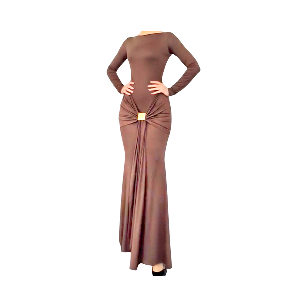 Pitkä ruskea juhlamekko kultaisella koristeella