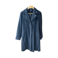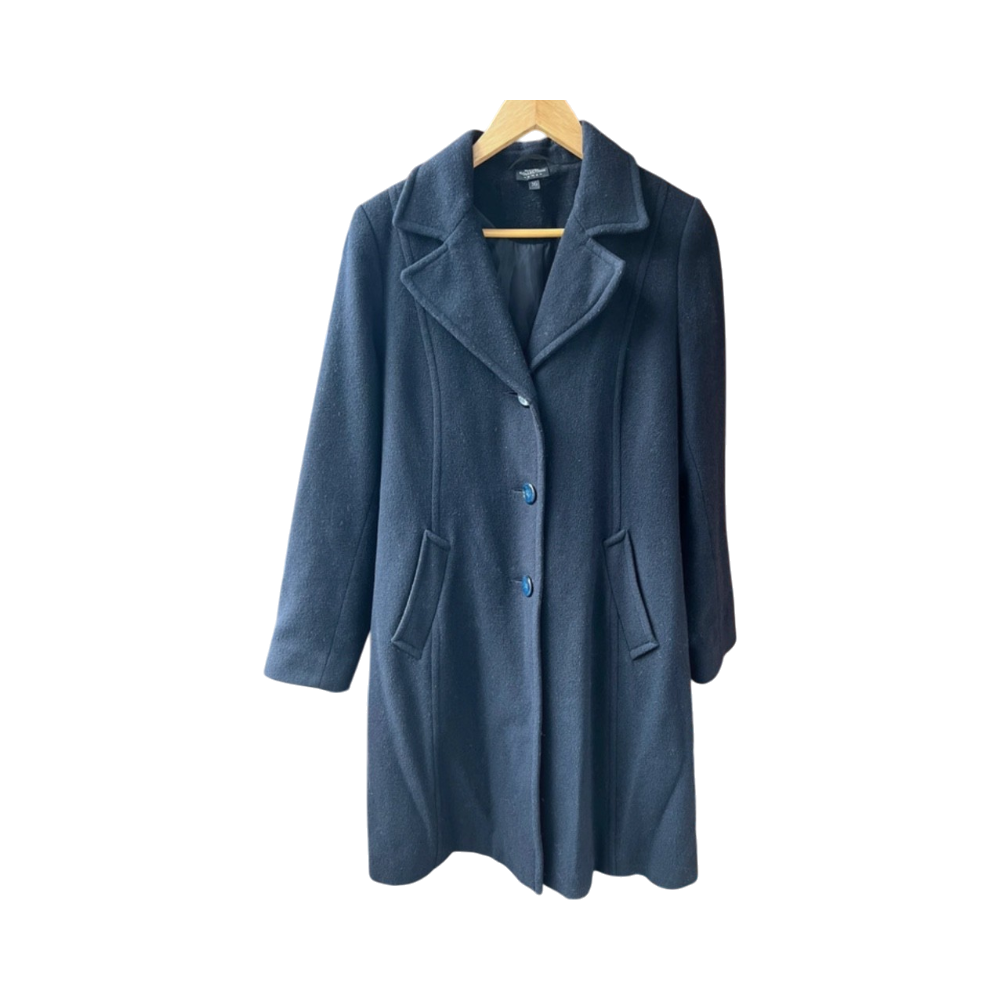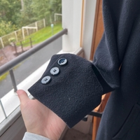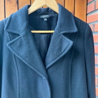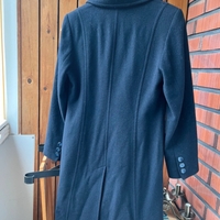 Erittäin hyvässä kunnossa. Klassinen kaulus, etutaskut. Sävy enemmänkin musta, vaikka tietyssä valossa vaikuttaakin laivastonsiniseltä. Koostumus 80% villaa, 20% polyamidi. Pituus olkasaumasta mitattuna 95 cm, kai-kai 46 cm. Sopii s-m kokoiselle.