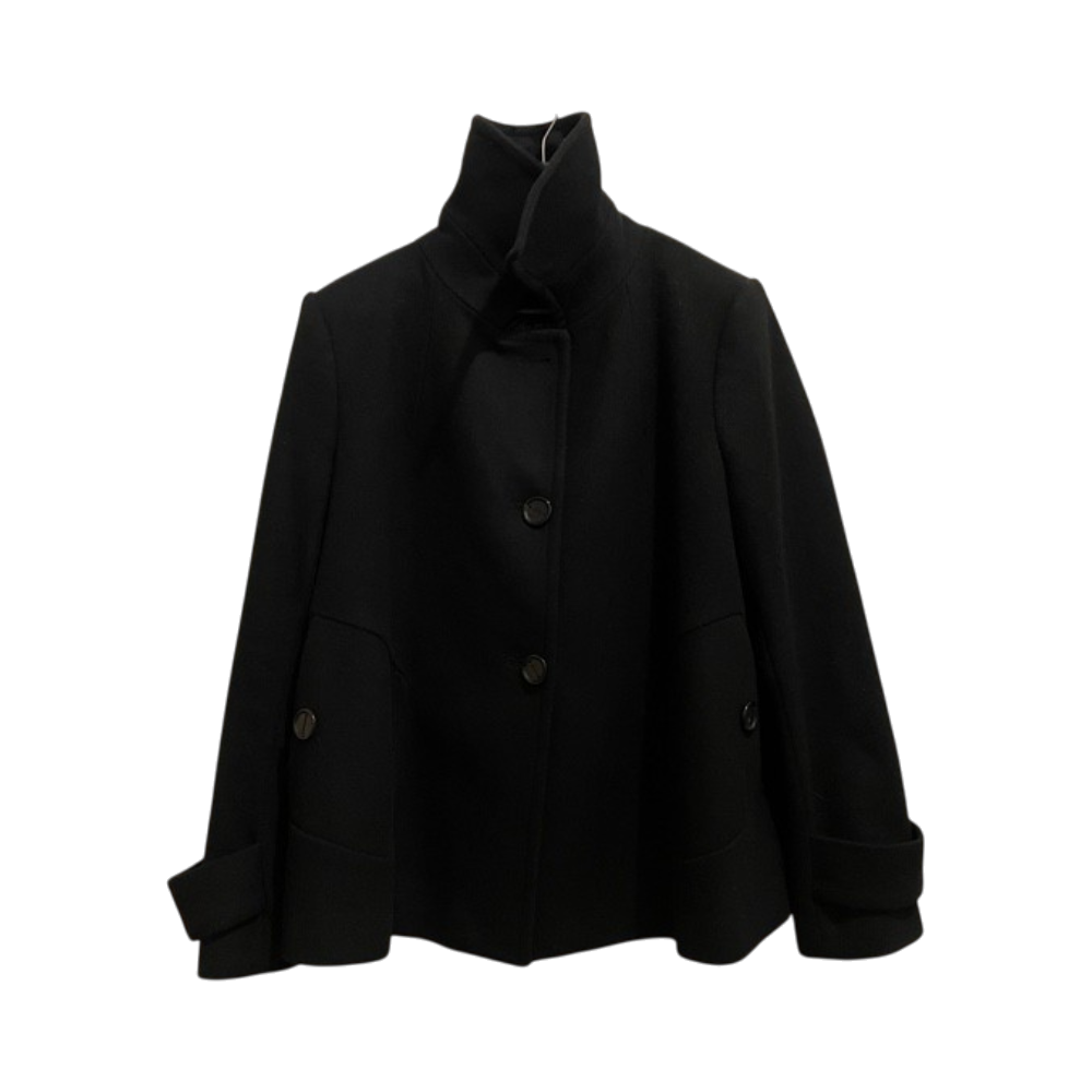 Classic short black coat with buttons and front pockets. Good condition, except top button is missing