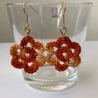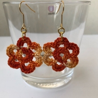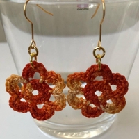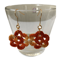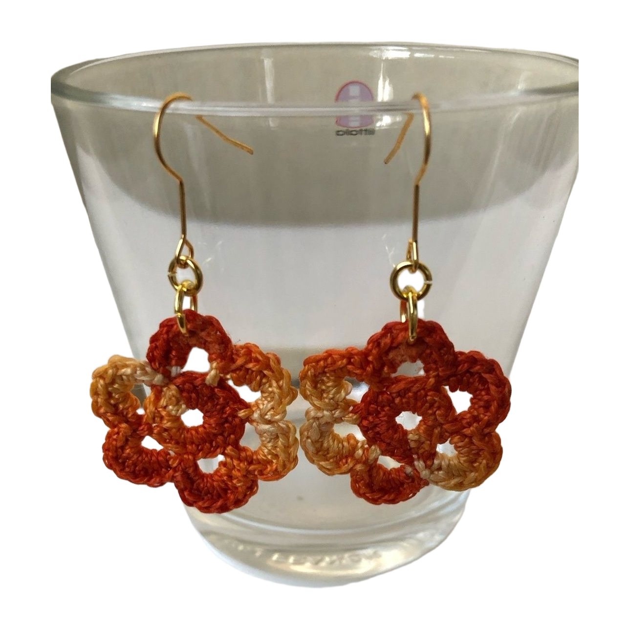 Uudet käsin virkatut liukuväri oranssin väriset kukka korvakorut. Metalliosat kullattua messinkiä.