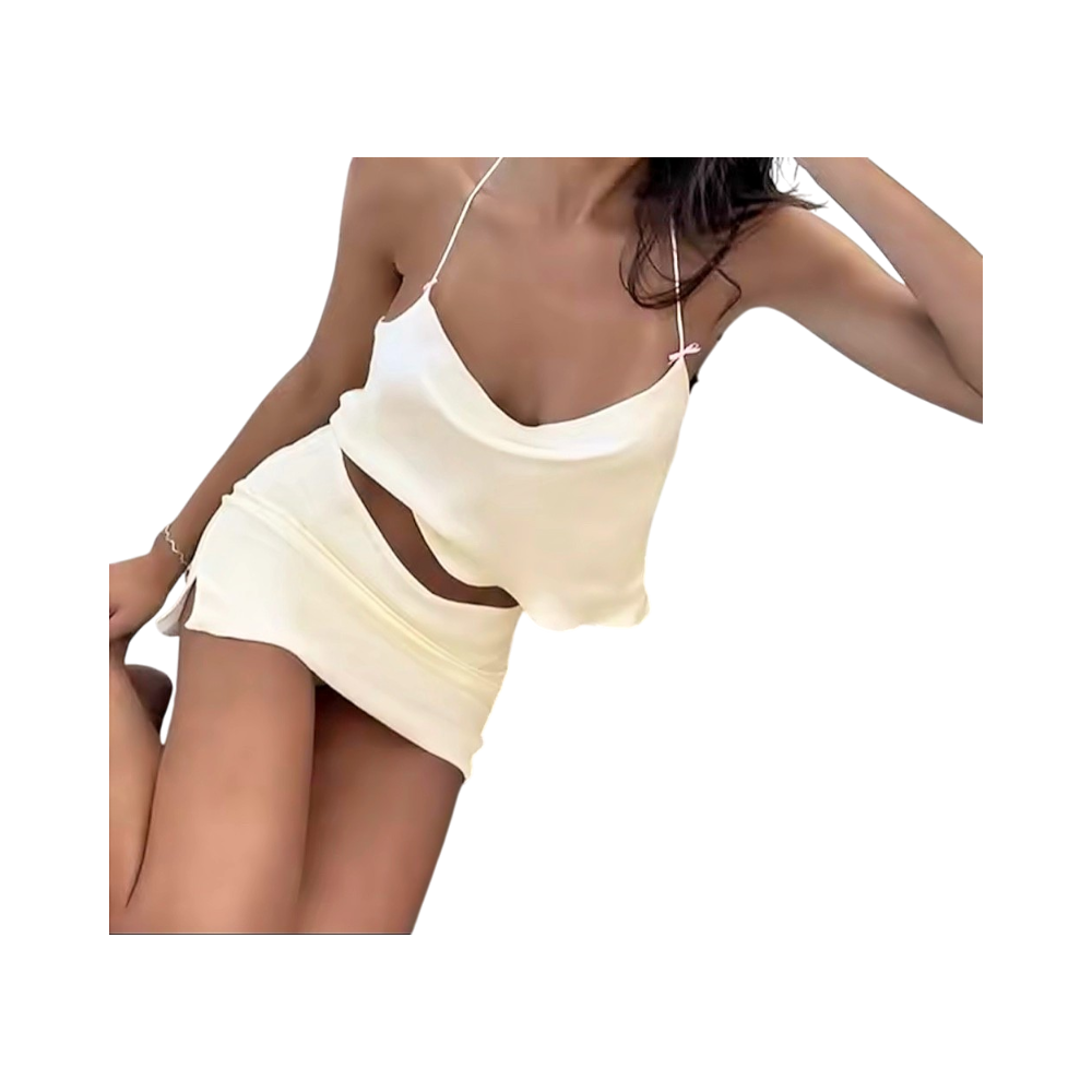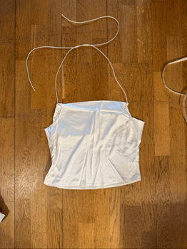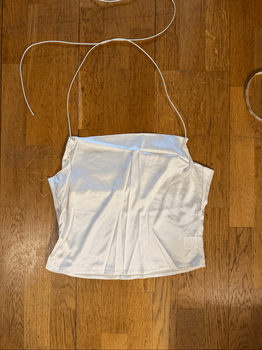 Valkoinen satiinitoppi, jossa ohut olkahihna. Sopii kesäisiin asuihin.