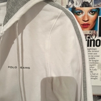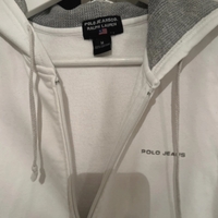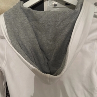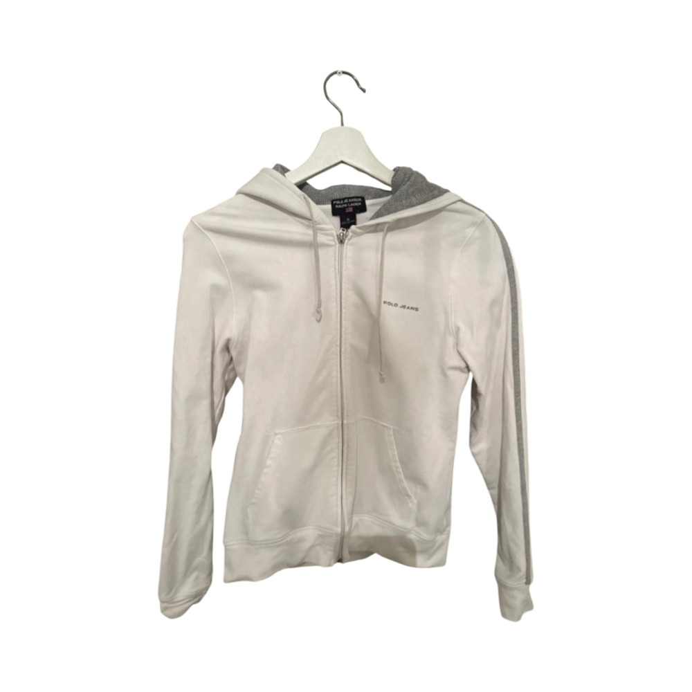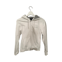 White zip-up hoodie with grey lined hood, small logo on chest.