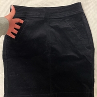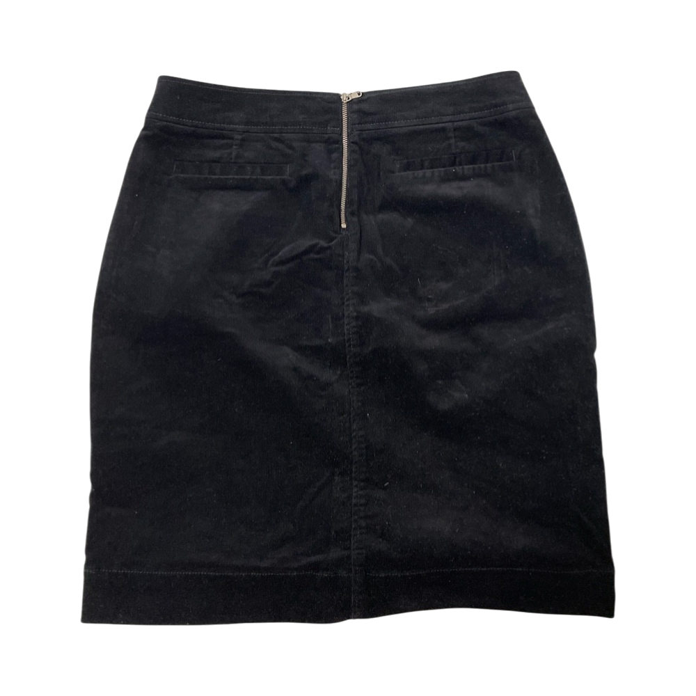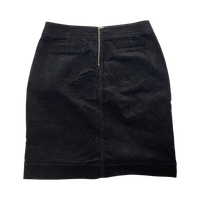 Lyhyt musta (valossa himean vihertää/sininen) samettihame vetoketjulla takana.