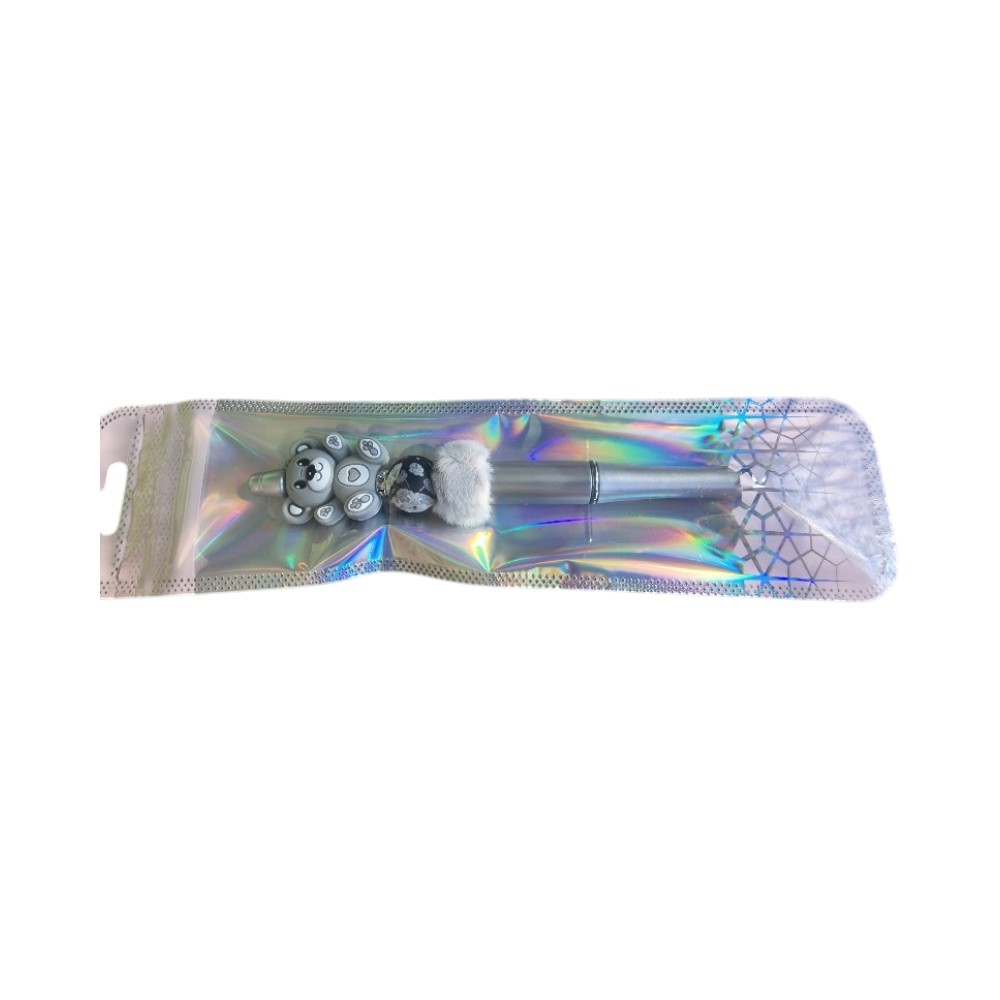 Suloinen hopeinen kynä nallekoristeella ja tekoturkishelmellä.
