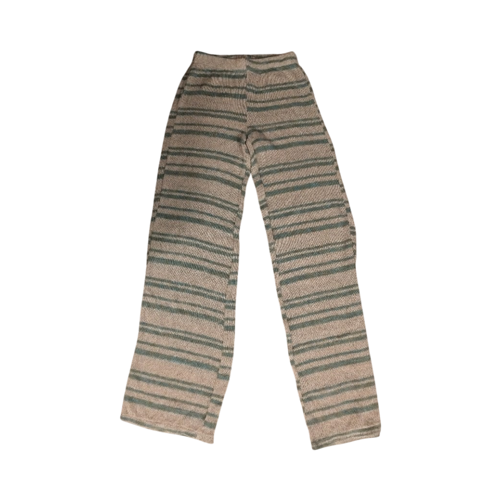 Pehmeät, suorat neulehousut raitakuvioilla.