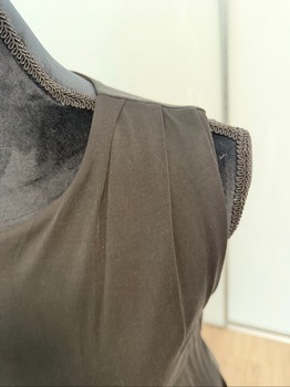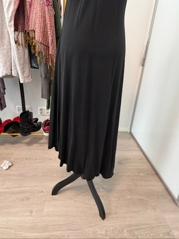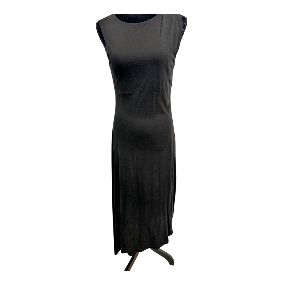 Sleeveless midi dress in black with a button closure at the back. Pleated detail at the shoulders.