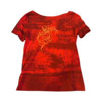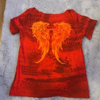 Punainen naisten t-paita oranssilla siipiprintillä.