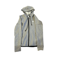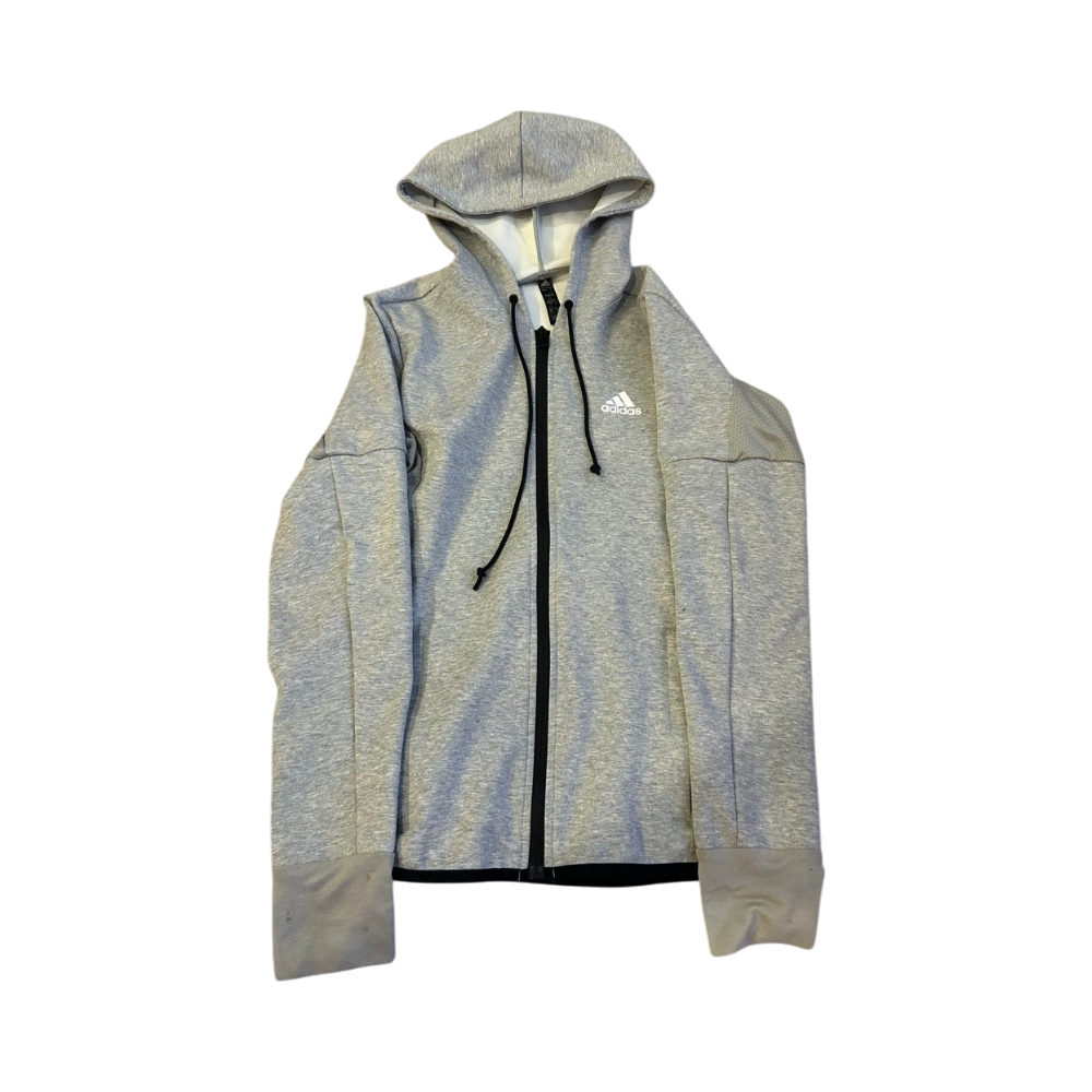 Harmaa naisten/miesten huppari, vetoketju, pieniä tahroja.