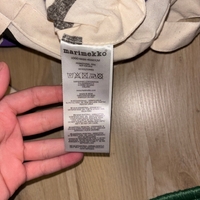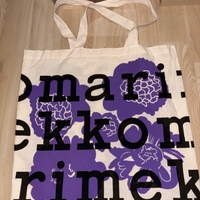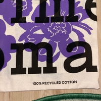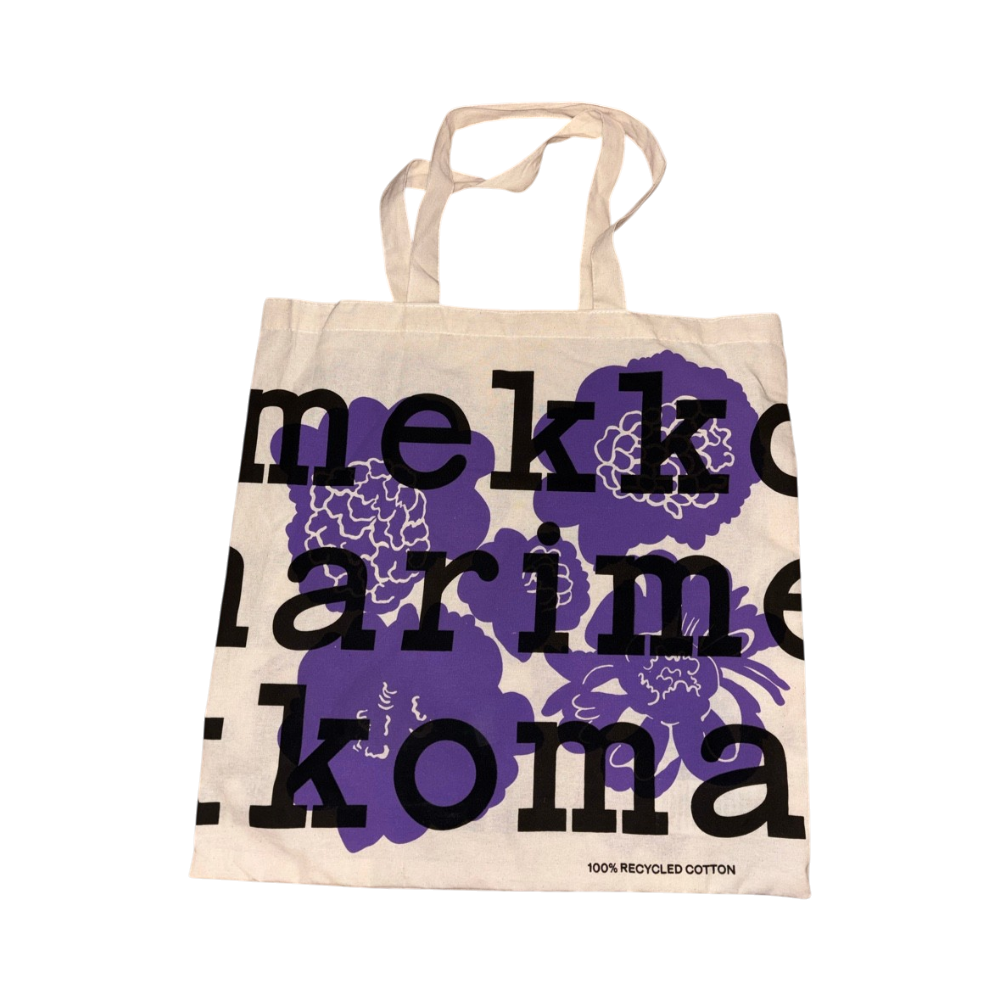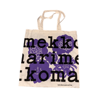 Valkoinen kangaskassi violetein kukkakuosein, 100% kierrätyspuuvillaa.