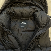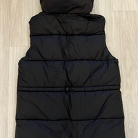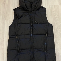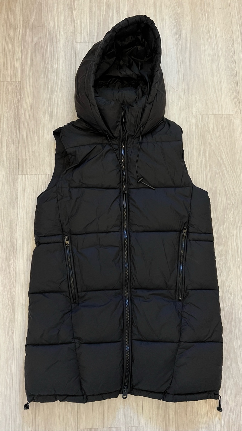 Pitkä, toppaava liivi hupulla ja vetoketjullisilla taskuilla.