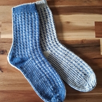 Käsinneulotut sinivalkoiset villasukat, käyttämättömät. Koko noin 38-40, varren pituus noin 12 cm, leveys noin 9,5 cm, pohjan pituus noin 23 cm. Voi pestä koneessa 40 °C villapesussa.