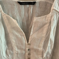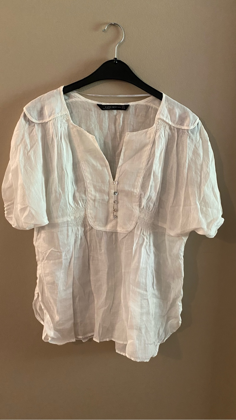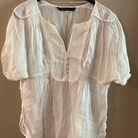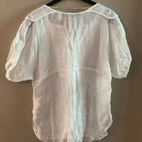 Valkoinen pellavapusero, napit edessä, lyhyet hihat.
