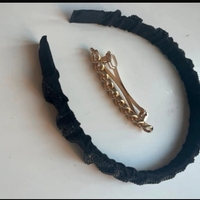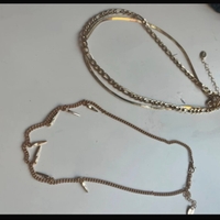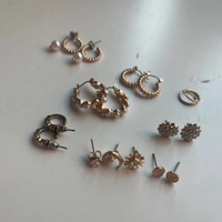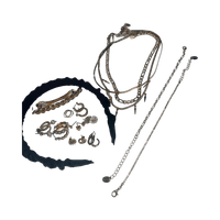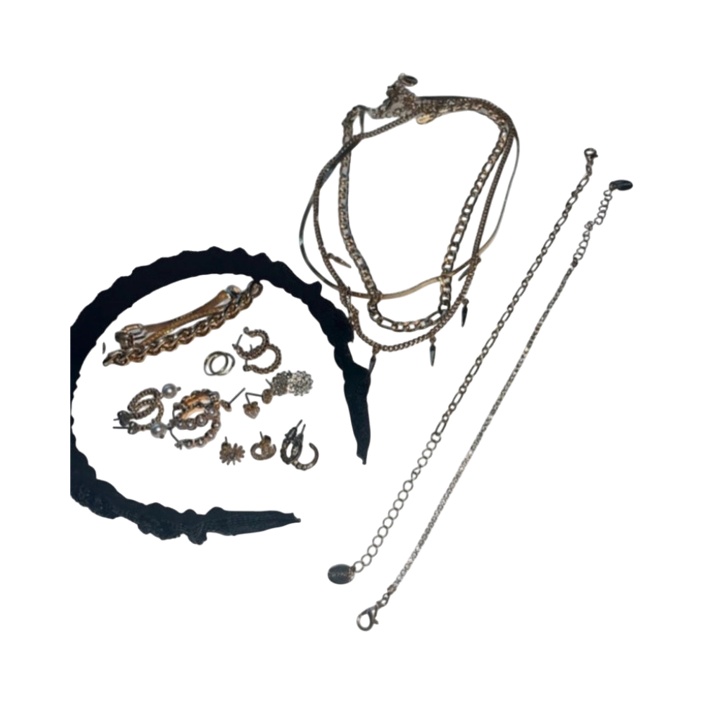 Sekoitus kaulakoruja, renkaat ja pantahiuskoristeita.