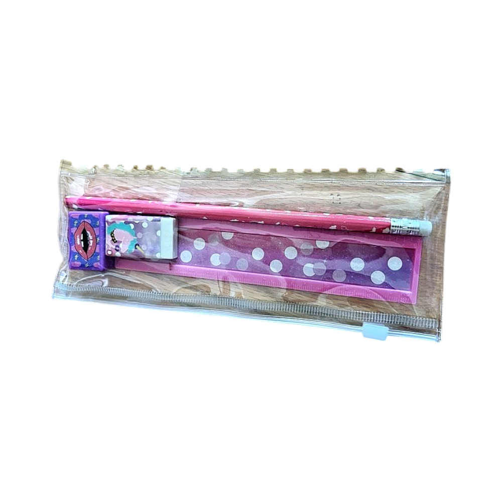 Pinkki kynä, viivotin ja pyyhekumi setissä. Käyttämätön