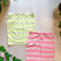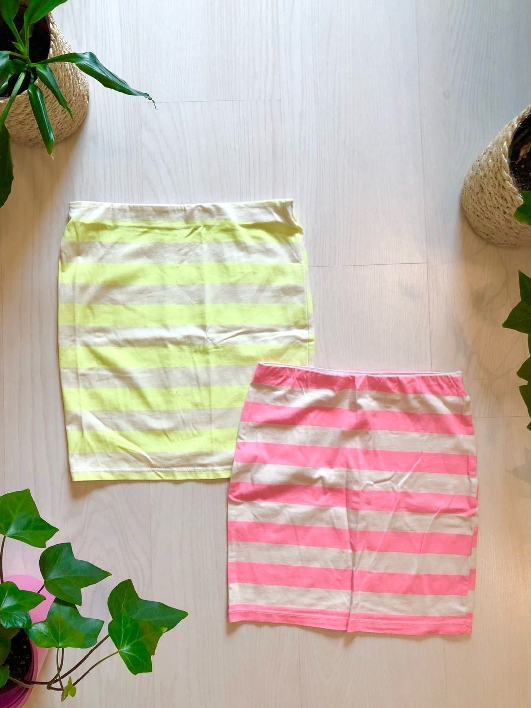 Kaksi ihanaa neon raitaista mini hametta. Toisessa neon keltaiset ja toisessa neon pinkit raidat. Molemmat kokoa S mutta vastaa mielestäni kokoa XS. En ole käyttänyt hameita koska ovat aina olleet itselle liian pieniä, mutta kutittavat laput leikattu pinkki raitaisesta pois, ja keltaisesta lappu lähtenyt roikkumaan. Erittäin mukavaa venyvää kangasta.