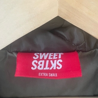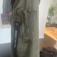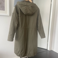 Pitkä khakin värinen takki hupulla, vetoketjulla ja taskuilla. Takaa pidempi, tikkivuori, rento , erittäin mukava päällä ja suht lämmin, koska vuori on tikattu, yhdestä taskusta puuttuu nappi.