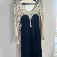 Pitkä mekko, musta helma ja valkoinen yläosa pilkuilla. Käyttämätön. Sample salesta.
