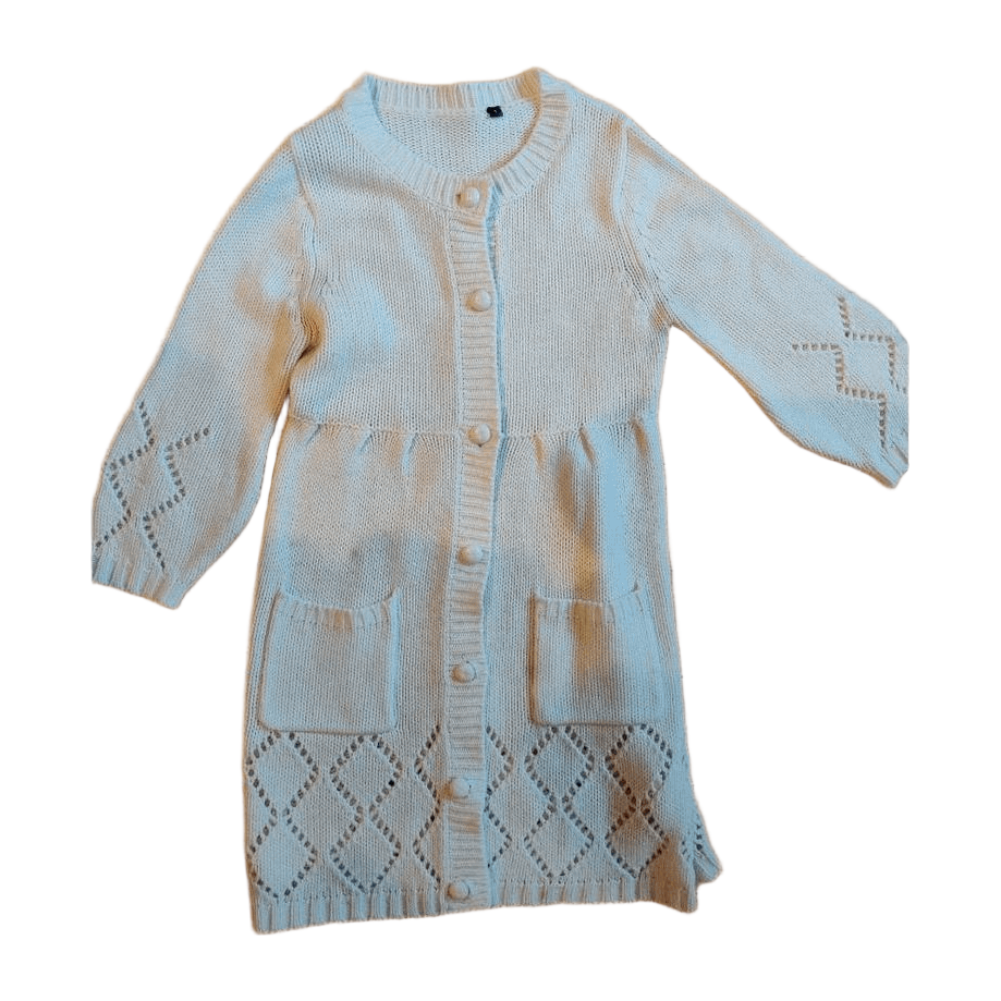 Naisten valkoinen neuletakki 3/4osa hihoilla. Hieman nukkaantunut. Kissatalous.