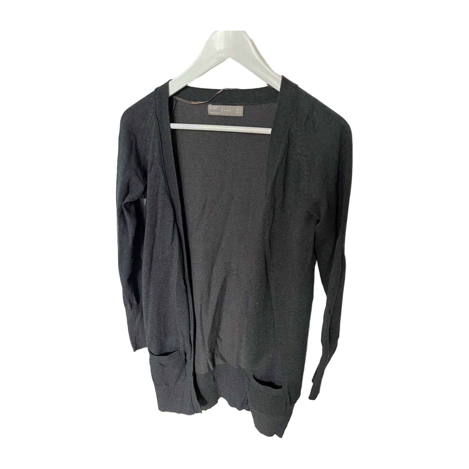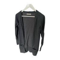Zara-merkkinen tumman harmaa puuvillaneule. Ei ole juuri ollenkaan nukkaantunut käytössä. Napitus ja pienet taskut edessä. Reisipituinen. Pienehkö S koko.