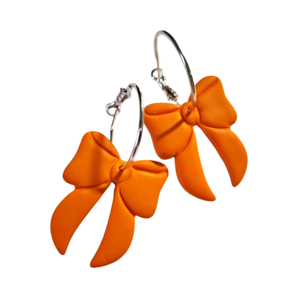 Oranssit rusettikorvakorut hopearenkaassa, halkaisija 2.5cm. Rusetit koko 4cm.
