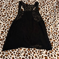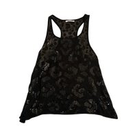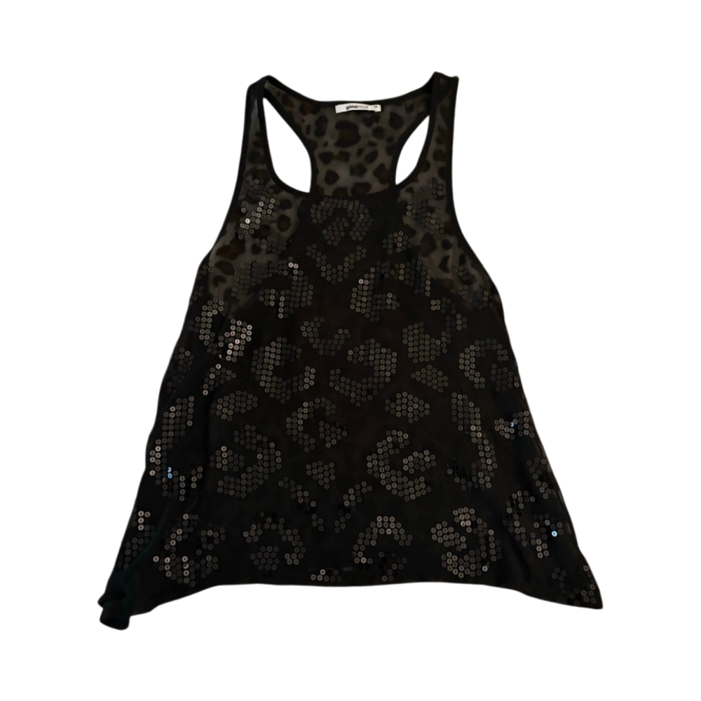 Sheer racerback tank with sequin leopard pattern, loose fit.
