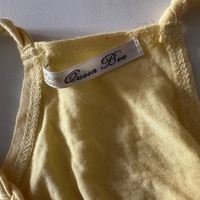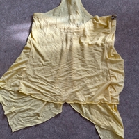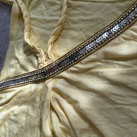 Keltainen toppi kultaisilla paljeteilla ja epäsymmetrisellä helmalla. Ei kokoa, arviona M, mittaa kuvista.