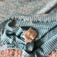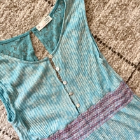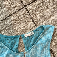Turkoosi mekko pitsiyläosalla ja napituksella edessä.