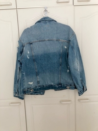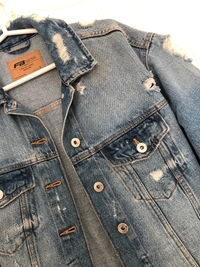 Sininen farkkutakki, kulutettu ja napillinen malli. Nouto Tre/Tku onnistuu myös