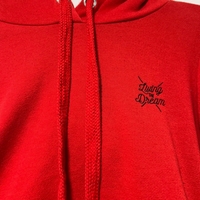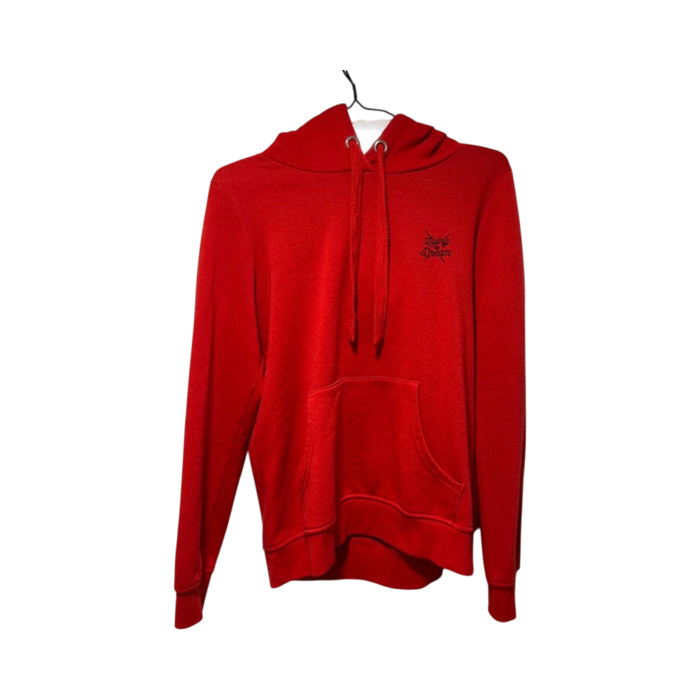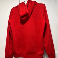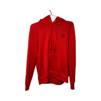 Punainen vetoketuton huppari, edessä pieni kirjailu.