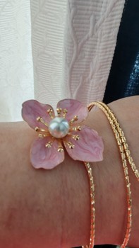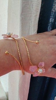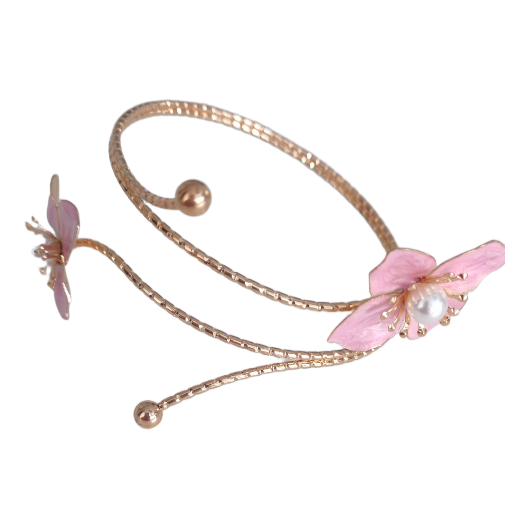 Kultasävyinen kierretty olkavarsi/nilkkakoru, jossa vaaleanpunaiset kukkakoristeet ja helmiyksityiskohdat. Säädettävä